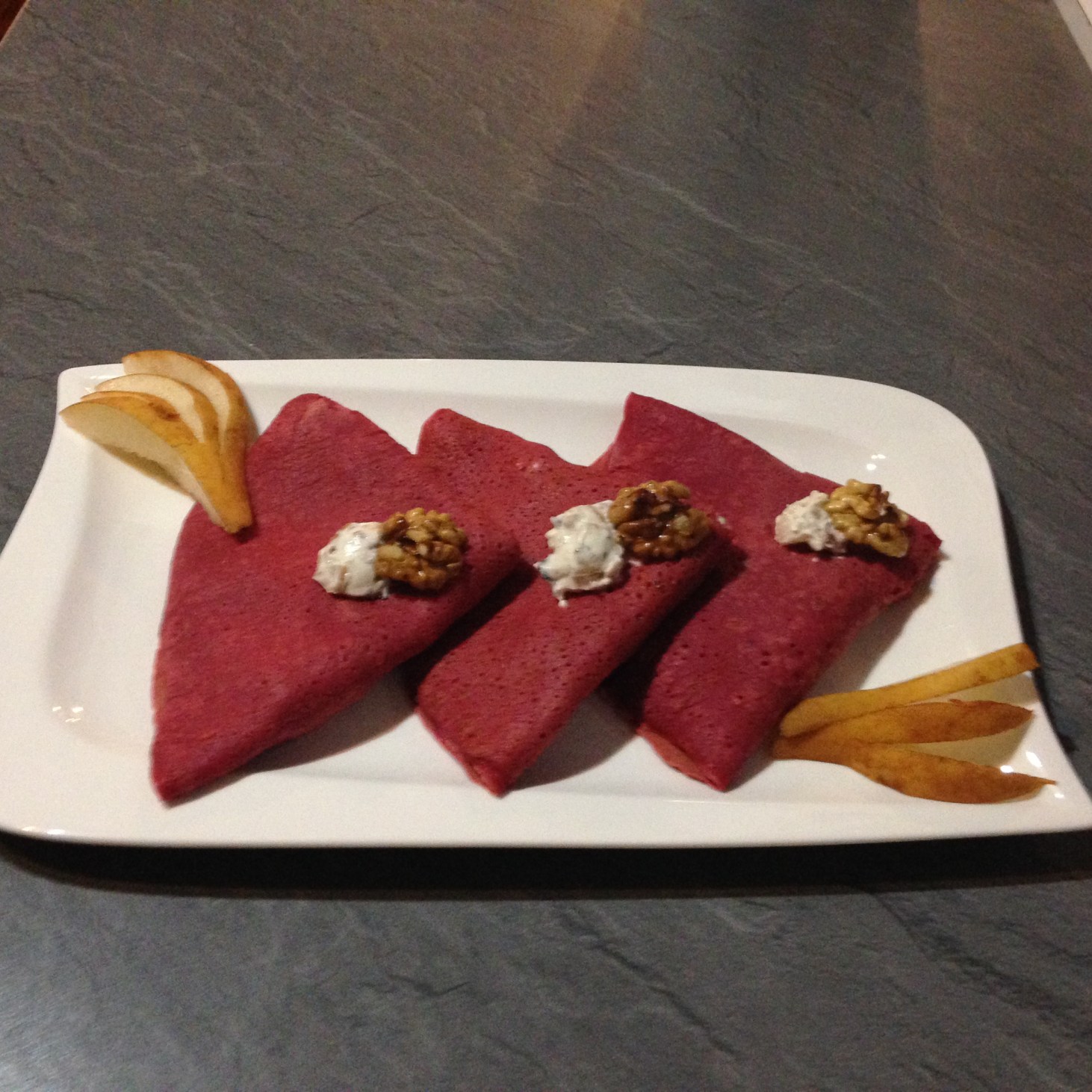 Rote Beete Palatschinken mit Walnuss-Birnen- Roquefort-Creme