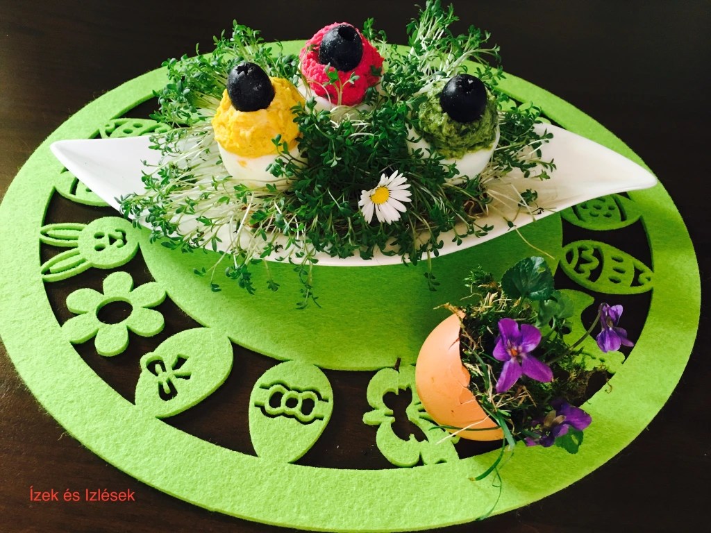 A hummuszhoz kevés céklát adtam, így lett piros a töltelék, a zöldet pedig avokádókrémmel (guacamole) töltöttem. A megtöltött tojásokat, kerti zsázsára ültettem.