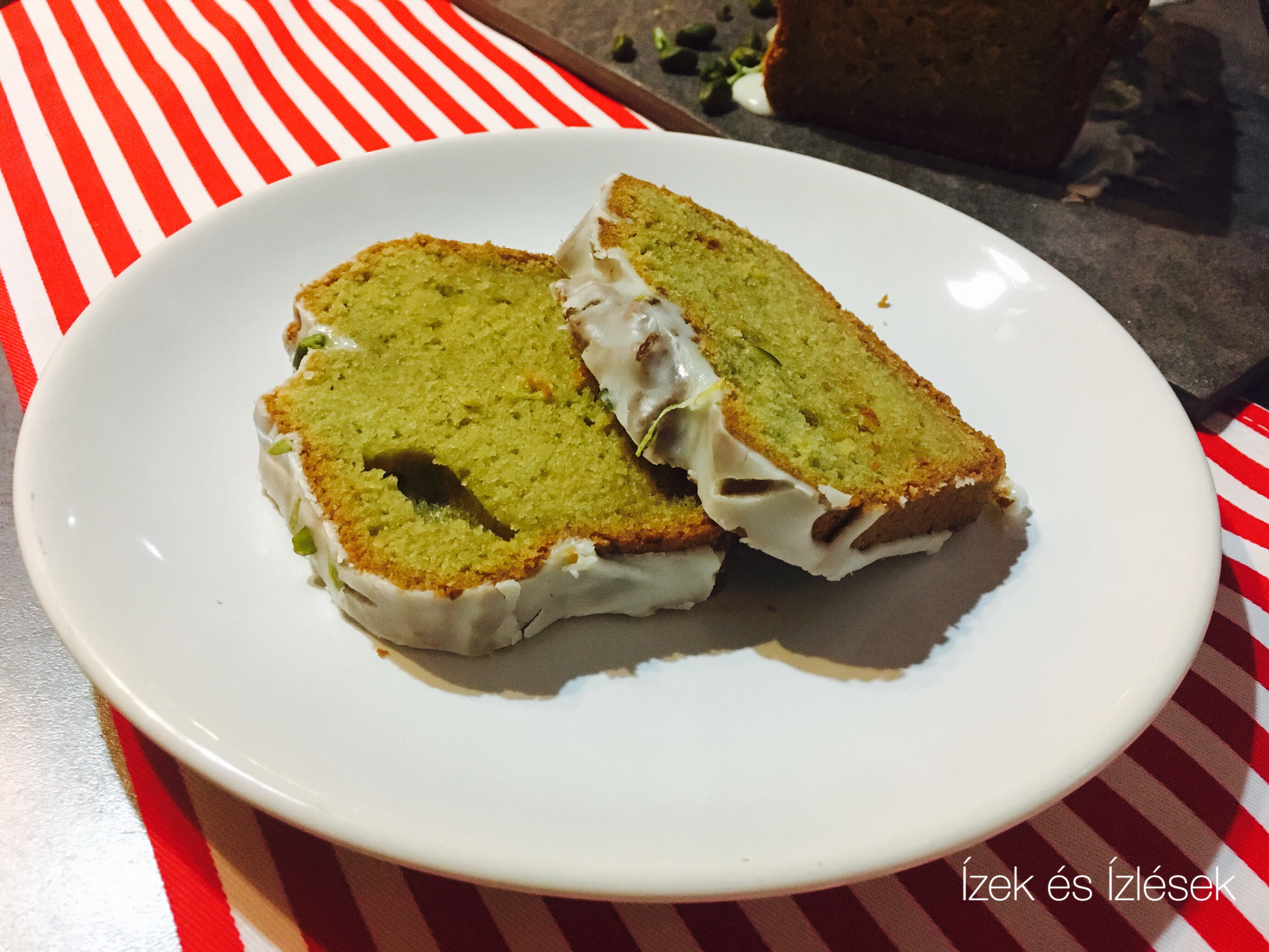 Egy kalácsformát kikenük vajjal, és liszttel megszórjuk, majd beleöntjük a masszát. Elömelegített sütöben 180 C°-on megsütjük (kb. 60-70 perc) Tü próbával ellenörízzük. A teteje kirepedt, de ez az ízén mit sem változtatott, kis cirommázzal korrigálhatjuk a szépséghibát. A porcukrot a citromlével habosra kavarjuk, ráöntjük a süteményre, durvára vágott pisztáciával megszórjuk.
