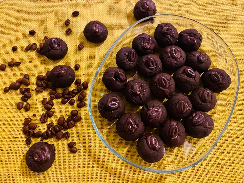 A fekete csokit göz fölött megolvasztjuk, és a keksz mélyedéseibe belecsepegtetjük, majd a tetejére egy csoki kávészemet rakunk.