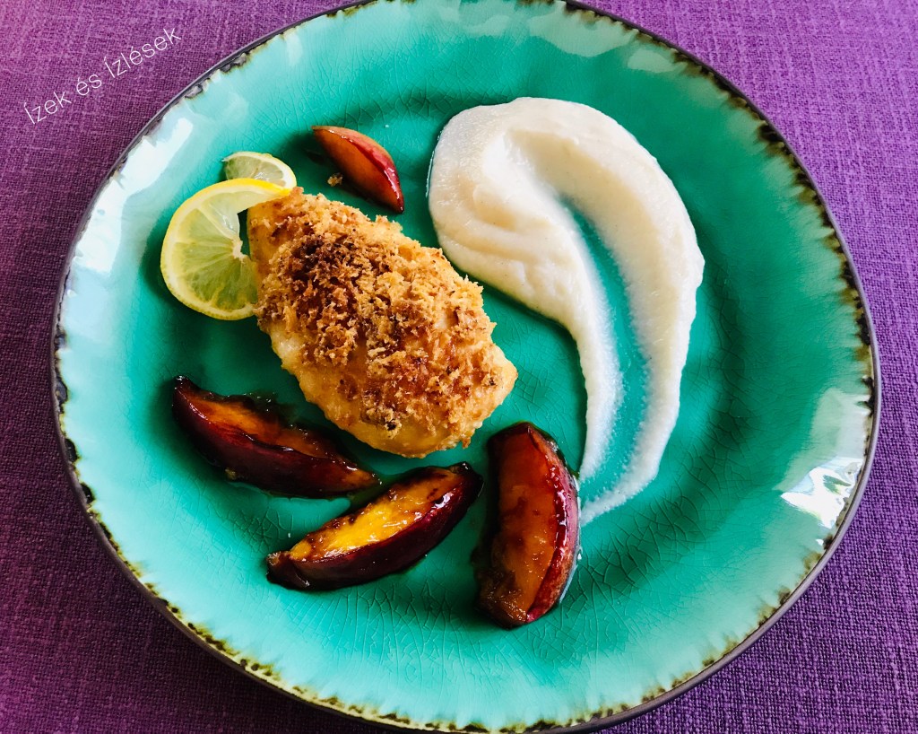 A csirkemelleket a karfiolpürével, és a karamelizált nektarinnal tálaljuk.