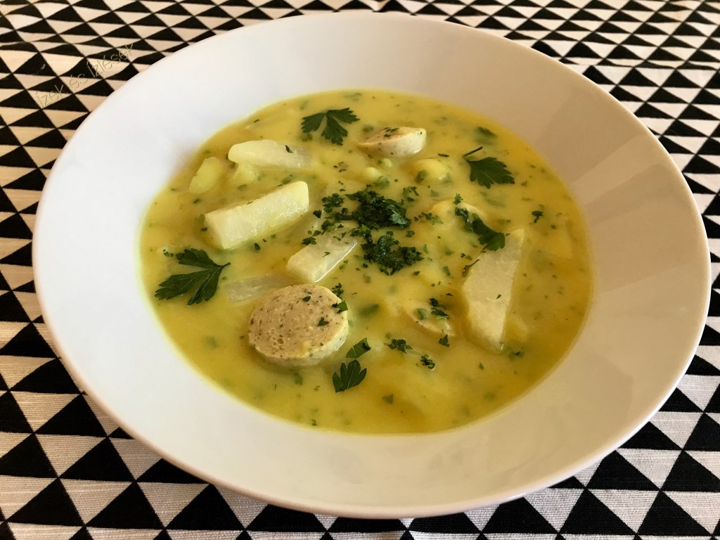 A karalábét meghámozzuk, és hosszukás csíkokra vágjuk. A vajat megolvasztjuk, átforgatjuk rajta a karalábét. Felöntjük az alaplével, fözzük 10 percig, majd felöntjük a tejszínnel. Belekeverjük a krumplipüreport, és a curry-t. Hozzáadjuk a karikára vágott fehér kolbászt, fözzük még 2-3 percig. A petrezselyem zöldet felaprítjuk és belekeverjük, ízlés szerint sózzuk.