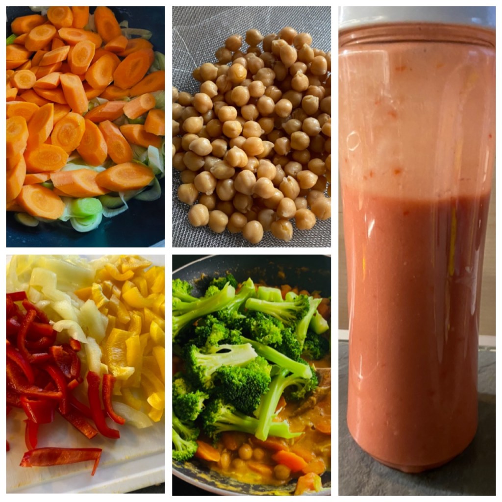 A póréhagymát az olivaolajon, megdinszteljük, hozzáadjuk a megpucolt srégen felvágott sárgarépát, a csíkokra felvágott paprikát. A csicseriborsót hideg vizzel átöblítjük és kb. 5 dkg.-ot kiveszünk belöle, a többit a zöldségekhez adjuk.