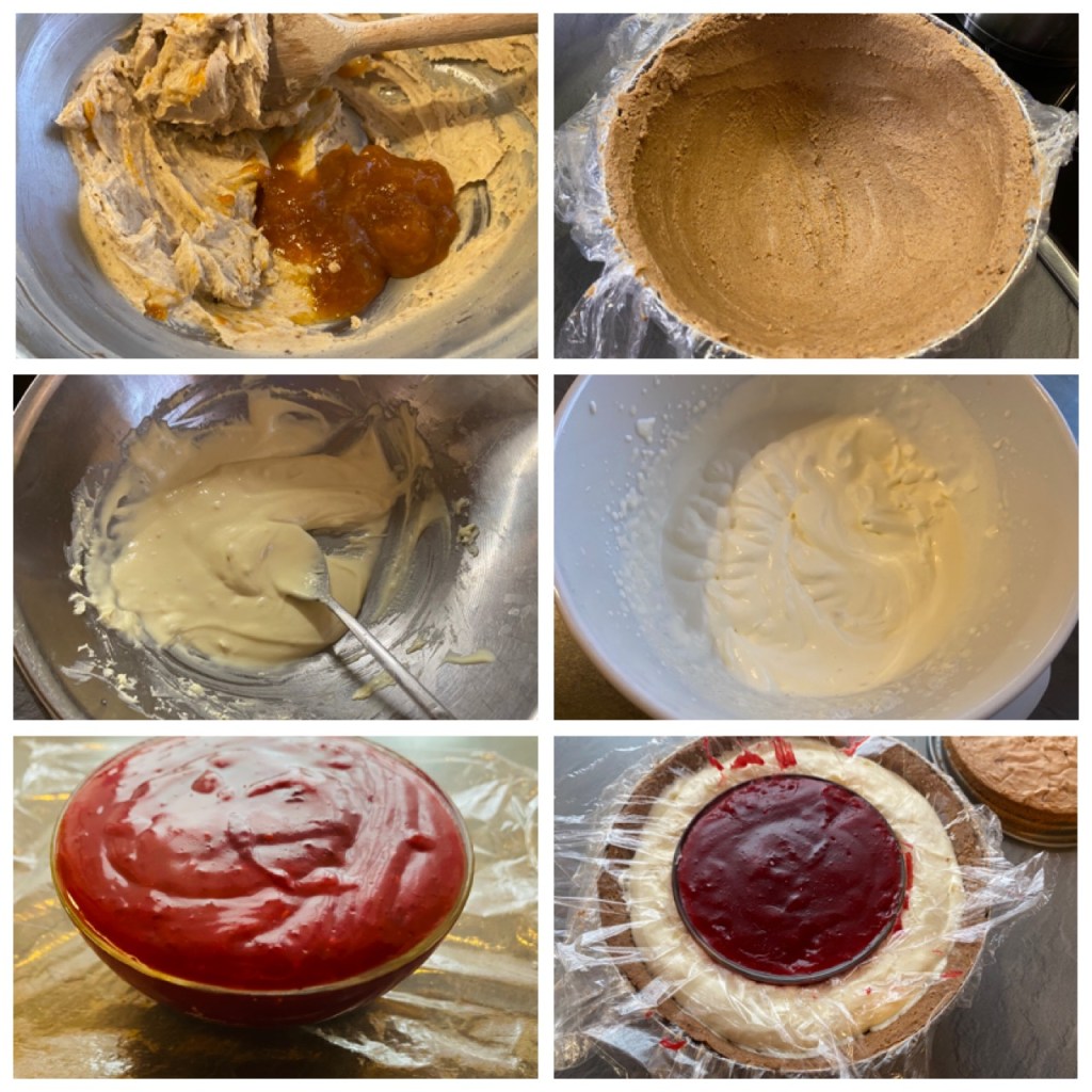 A gesztenyemasszát a vajjal kikeverjük, hozzáadjuk a baracklekvárt, a kekszmorzsát, a kakaót és a rumot. Jól összedolgozzuk, majd a tálat kitapasztjuk ezzel a gesztenyés -kekszes masszával. Egy vizes evökanállal elsímítjuk a belsejét. Hütöszekránybe tesszük ameddig készülnek a többi rétegek.