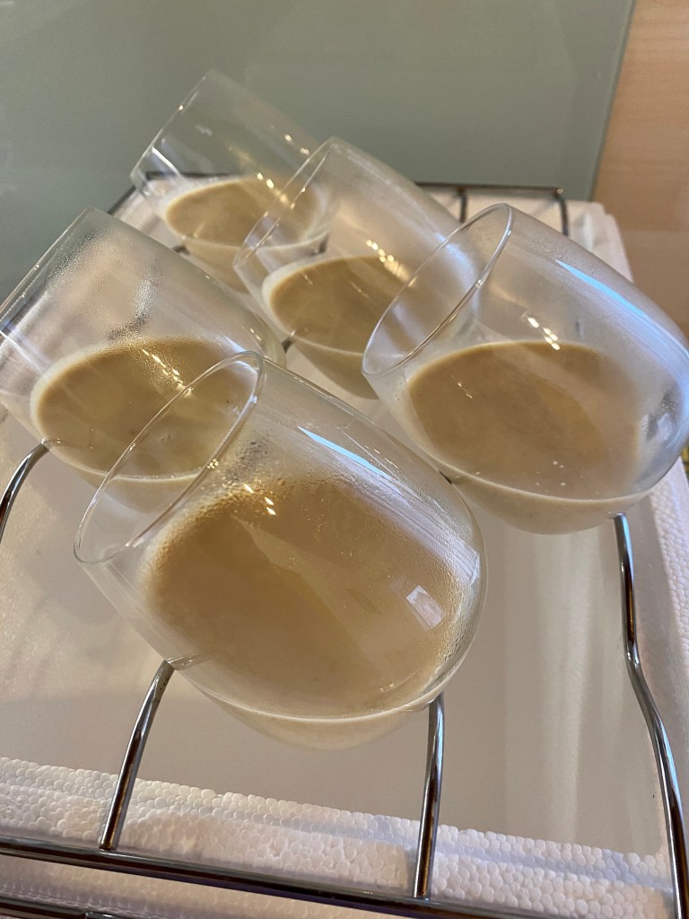 A pannacottát poharakba öntjük és ferdén egy erre alkalmas rácsra, (tojástartóba )helyezzük.