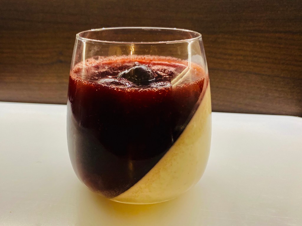 Közben elkészítjük a meggyes részt. A zselatin lapokat, a megmaradt 5 db.-ot szintén hideg vizbe beáztatjuk. A meggylevet a kiolvasztott meggyel a cukor másik felével, rummal, és a puncs füszeres ízesítövel felforraljuk. Az étkezésikeményítöt hideg vizel vagy meggylével elkeverjük és hozzáöntjük a felforrt meggyléhez. Hozzáadjuk a viztöl kinyomkodott zselatinlapokat. A meggyes-zselét beleöntjük a panna cotta másik felébe, és egyenletesen elosztjuk a poharakban.