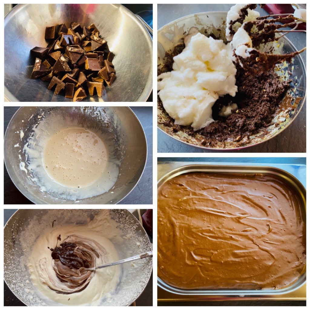 A tejszínt habbá verjük és összeforgatjuk a csokis masszával. Kiöntjük egy nagyobb tepsibe, tálba és pár órára hütöszekrénybe tesszük.