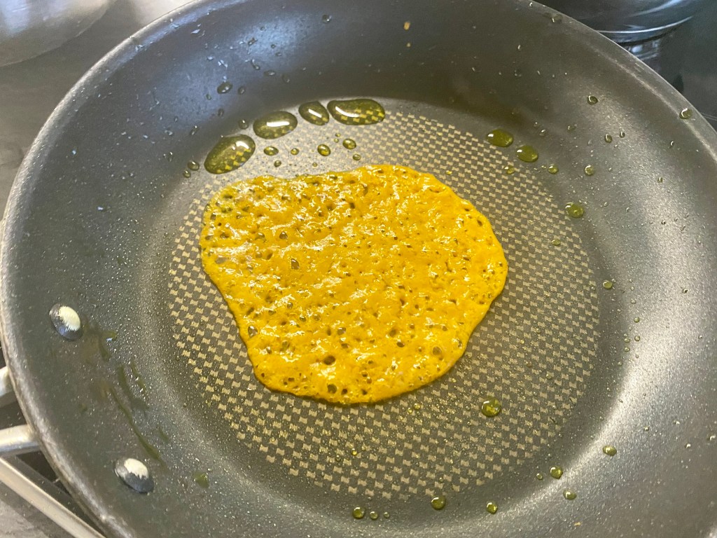 A vizhez hozzáöntjük az olajat, hozzákeverjük a lisztet és a színezöt, ez esetben természetes színezéket használtam, kurkuma füszert. A serpenyöt felforrósítjuk és evökanálnyi halmokat rakunk a tapadásmentes serpenyöbe.