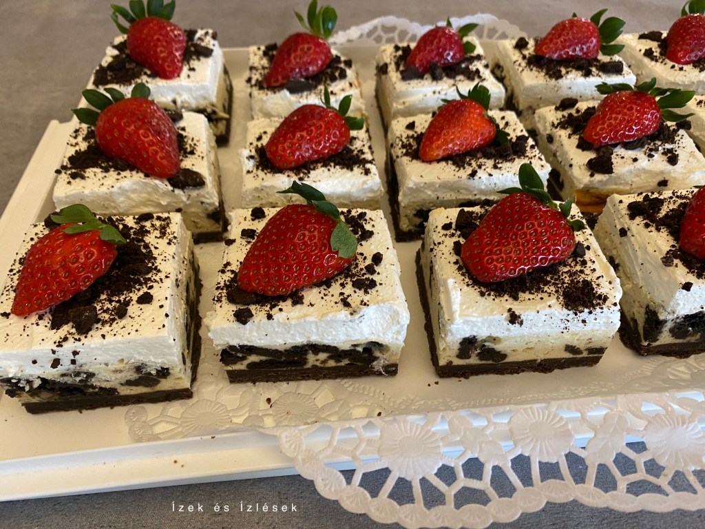 A sütit egyforma négyzetekre vágjuk, félbevágott eperrel díszítjük.