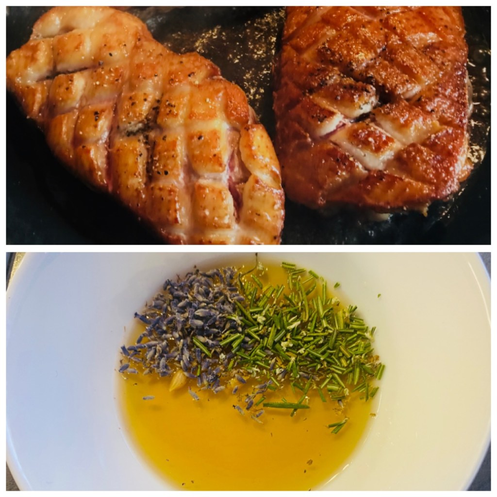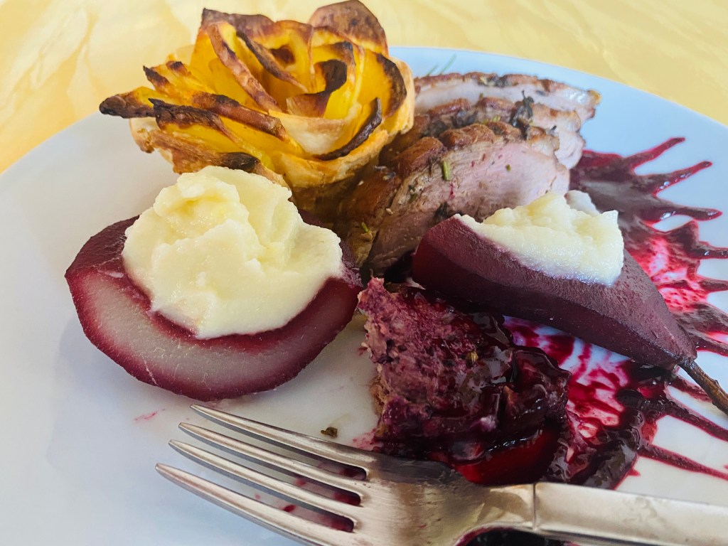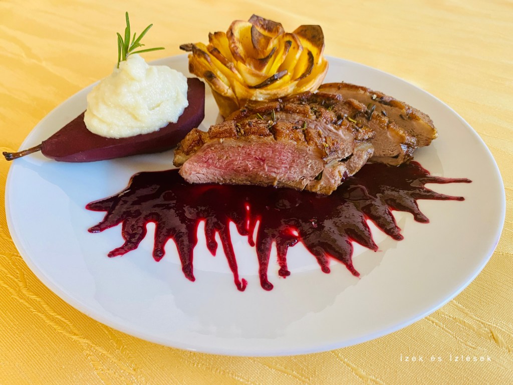 Rosé kacsamell, mézes levendulás-rozmaringos pácban, mellé köretként szederborban párolt körte, melyet gyömbéres karfiolpürével töltöttem, erdeigyümölcs mártás, és ropogós krumplirózsa.