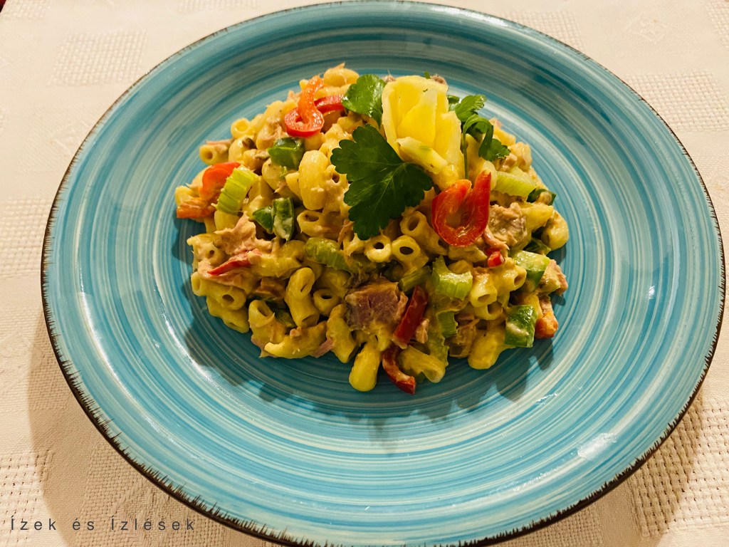 Mindent belepakoltam ami a hütöben volt, elsösorban a fött, füstölt sonkát,a maradék steak-et vékonyra felcsíkoztam, zellerszárat, paprikát, ananászt… Lehet variálni ízlés szerint csemegekukoricát, zöldborsót adni hozzá, majonézhez pedig tejfölet így könnyedebb és valamivel diétásabb az öntet.