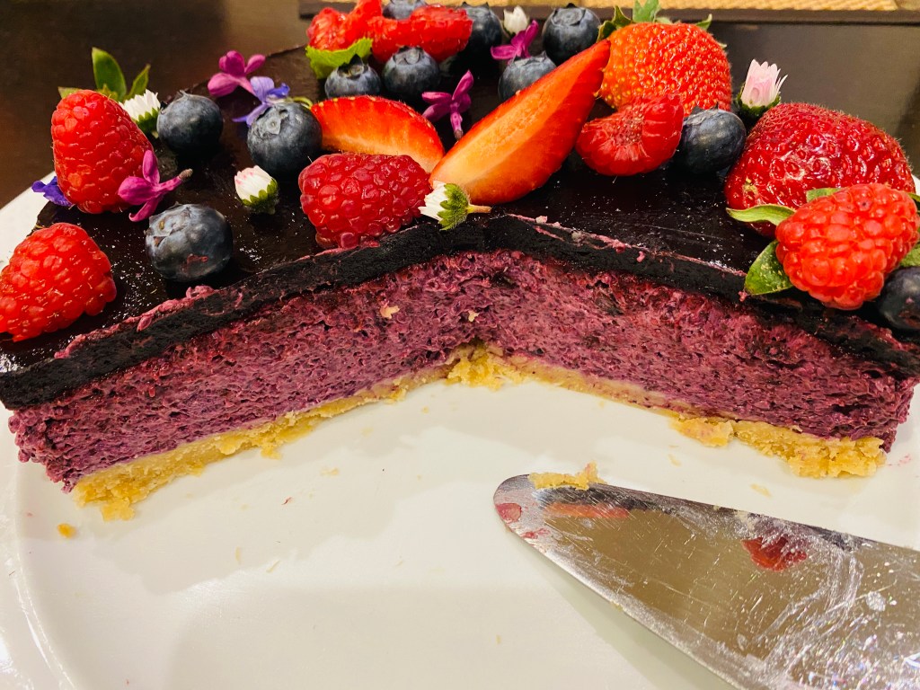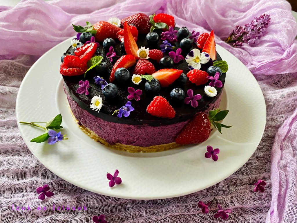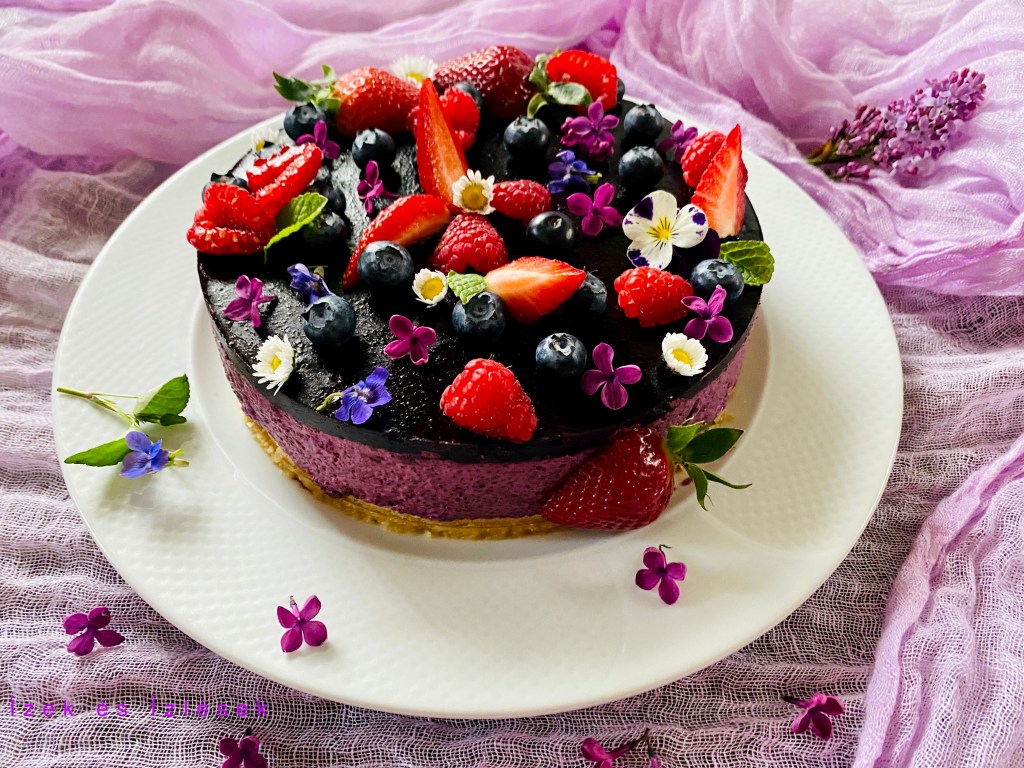 Ráöntjük a torta tetejére, áfonyával, eperrel, málnával, ehetö virágokkal diszítjük.