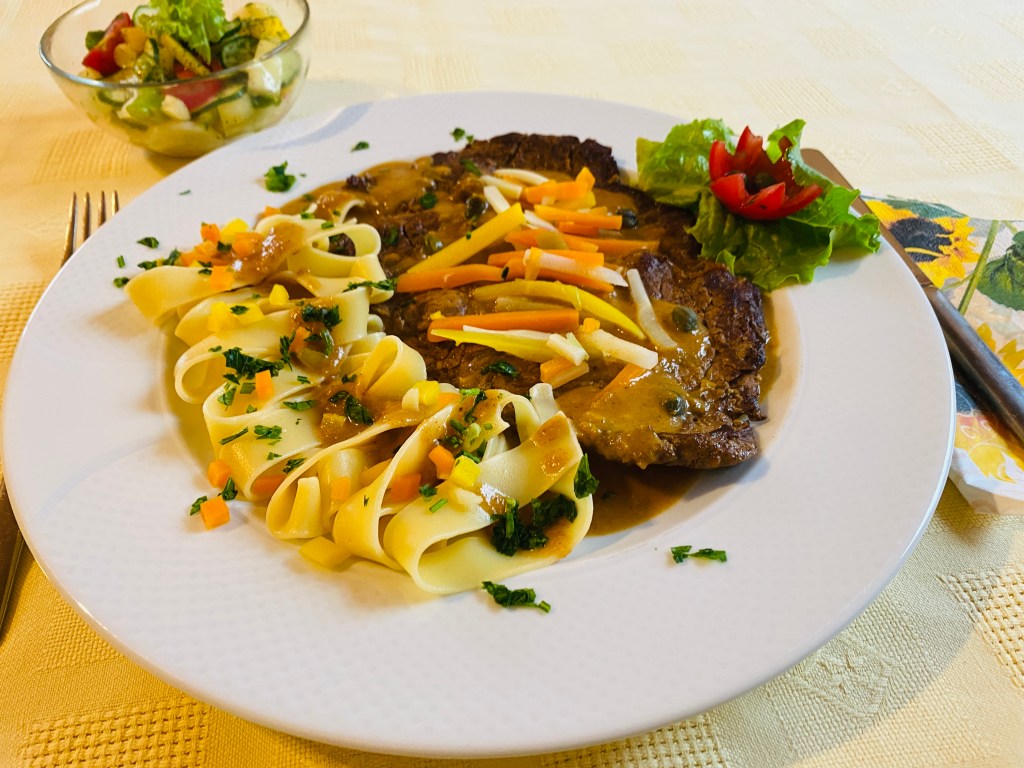 A rostélyost széles metélt tésztával tálaljuk, a pürésített mártással, a blansírozott zöldségekkel, megszórjuk petrezselyemzölddel.