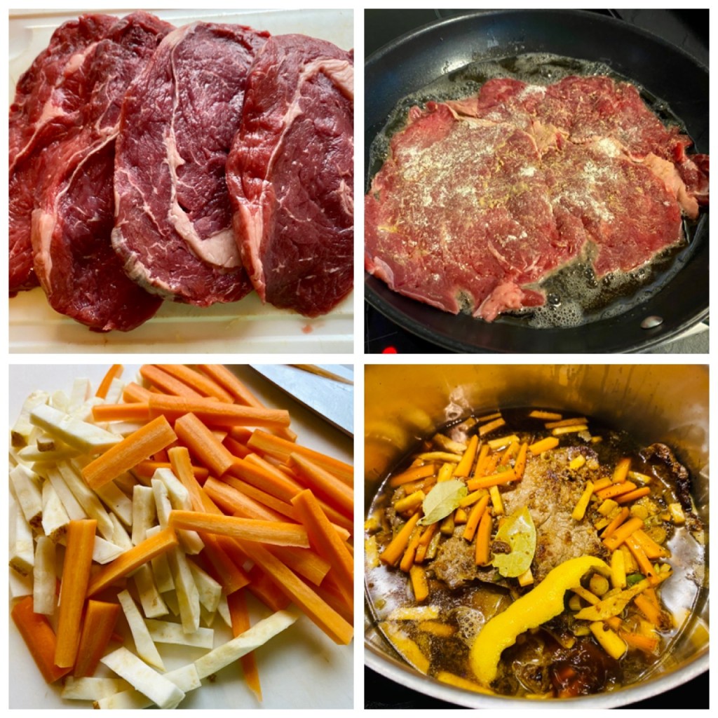 A rostélyos szeleteket kiklopfoljuk, széleit bevágjuk, borssal füszerezzük. Mindkét felét bekenjük mustárral, és megszórjuk liszttel. A hússzeleteket forró zsírban megpirítjuk, majd kivesszük a serpenyöböl. A zöldségeket vékony csíkokra (julienne-re) vágjuk.