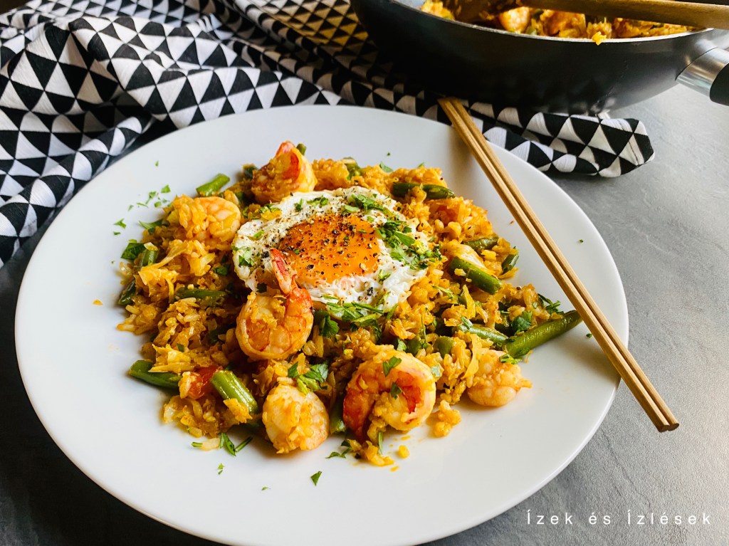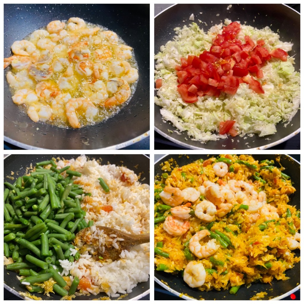 Addig pároljuk ameddig már majdnem odakap, de közben kevergetjük, hozzáadjuk a rizset és a zöldbabot, a garnélát. Alaposan összekeverjük, hagyjuk még pár percet a tüzön.