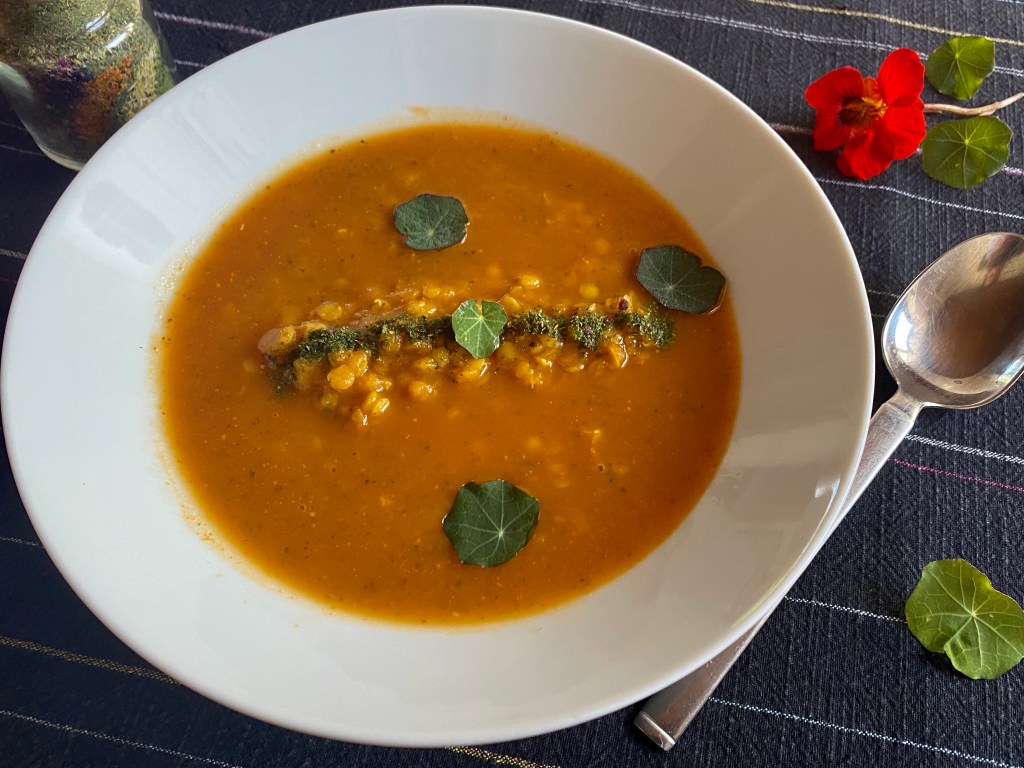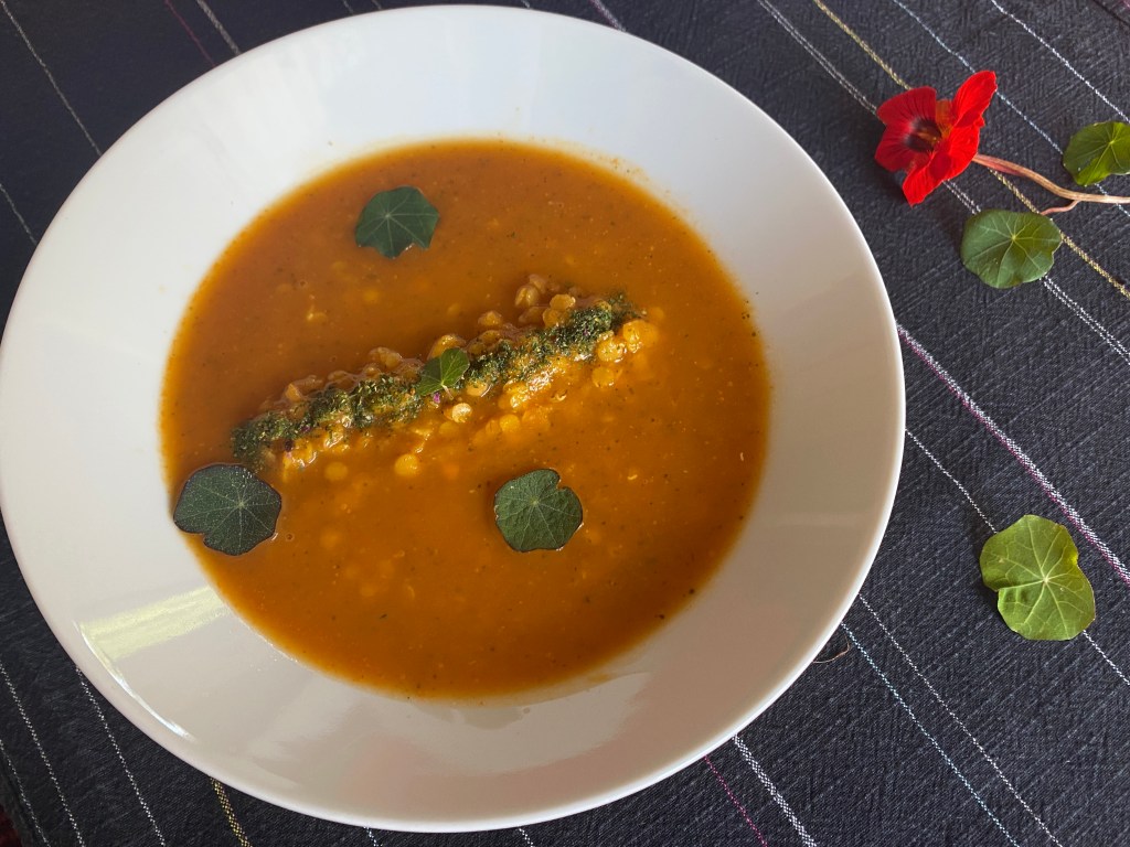 Amikor nekifogtam, nem tudtam milyen leves lesz belöle, csak összeraktam ami épp a kamáramban volt, néhány répa, kevés zellergumó, cukkini. Belekerült még egy darabolt paradicsomkonzerv, és percek alatt krémlevessé varázsoltam. Levesbetétként, vöröslencsét föztem bele, mivel áztatás nélkül 10 perc alatt megfö. Szeretem mert hántolás során megszabadítják a nehezen emészthetö héjától, így hamar megpuhul, és nagyon egészséges, tele van rosttal, ásványi anyagokkal, és vitaminokkal. A tetejét megszórtam szárított füszernövényekkel, és még rácsipkedtem néhány sarkantyúvirág levelet mielött a fagy megcsípné.
