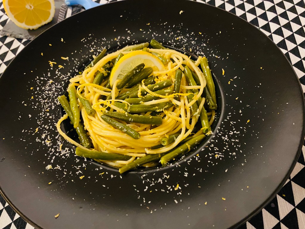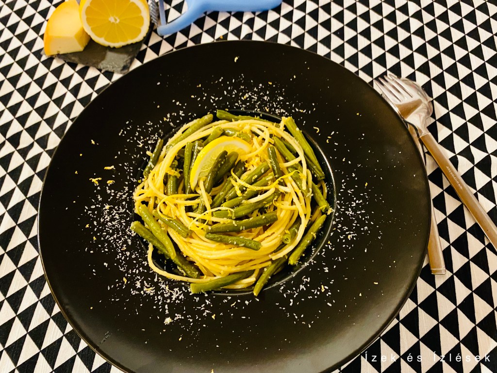 Eredetileg “Spagetti al limone” akart lenni, aztán tettem hozzá zöldbabot, hogy valami mutasson is benne, ne a csupasz spagettit együk. Bár az íze akkor is kárpótol mindent, enyhén fokhagymás, citrusos, parmezánnal megszórva a legfinomabb.