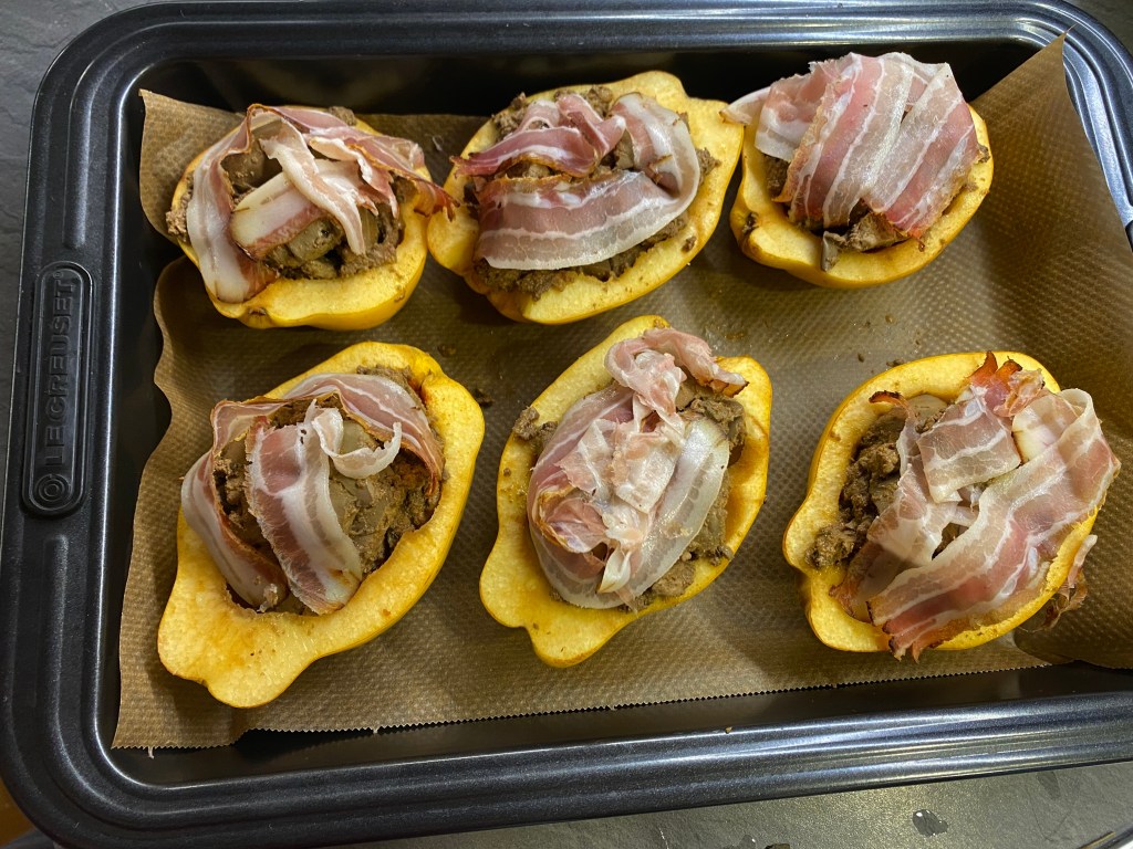Az almák tetejére vékonyra szeletelt bacont rakunk, hogy ne száradjon túl ki. 20-25 percig sütjük.
