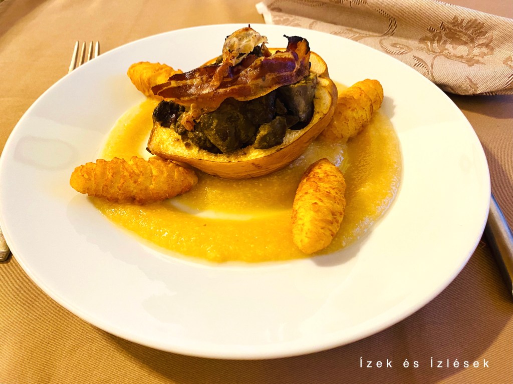 A megfött alama belsejét pürésítjük. A töltött almákat burgonya krokettel, almapürével tálaljuk.