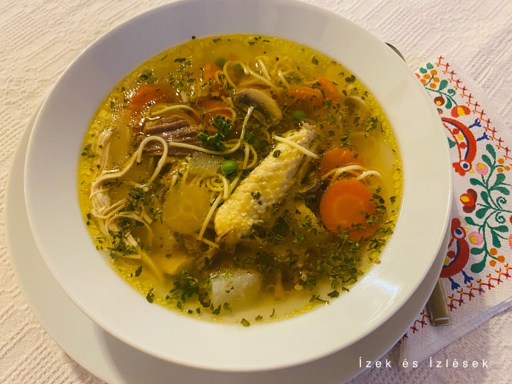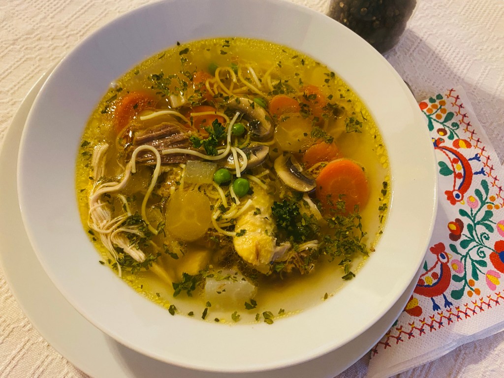 De hogyan is készül ez a leves? Àllítólag van benne marhahús is, szárnyas is, aprólék, és sokféle zöldség van belefözve, a gyökérzöldségeken kívül, borsó, gomba, kelkáposzta, paradicsom, zöldpaprika, gyömbér, sáfrány, és házi készítésü cérnametélt.