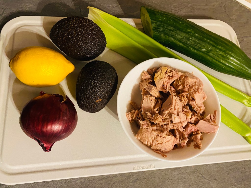 Az avokádót megpucoljuk, felszeleteljük, az uborkát is. A tonhalkonzervet leszürjük, lecsepegtetjük.