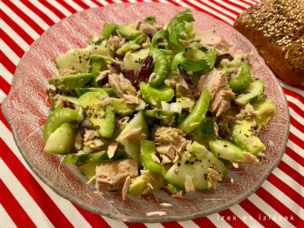 A zellerszárat felcsíkozzuk, a hagymát ízlés szerint apróra vagy karikára vágjuk. Összevegyítjük egy tálban, a tonhallal. Rácsavarjuk a citromlevet, hozzáadjuk az olivaolajat, sózzuk, borsozzuk ízlés szerint.