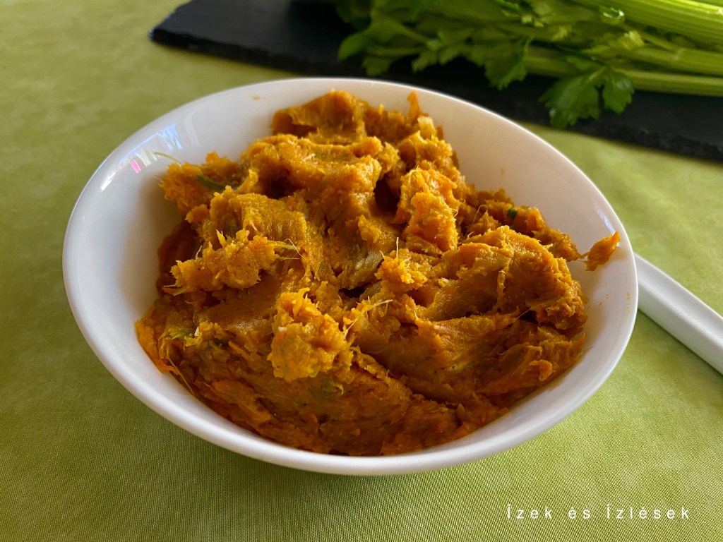 Az édesburgonyát megsütjük, miután kihült, pépesítjük. Hozzáadjuk a zellerrostot, vagy a burgonyát a darabokra vágott zellerszárral turmixoljuk. Belereszeljük a sárgarépát, ízesítjük mustárral, chilivel, sóval és citromlével. Pirítóssal, tökéletes reggeli, vagy akár vacsora.