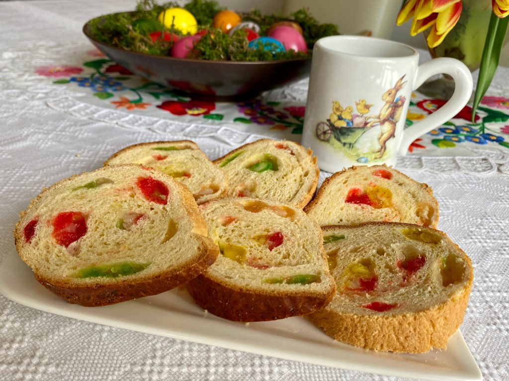 Húsvétra egy finom, citromos, kerek kalácsot készítettem. A színes rahát darabkák kikacsintgatnak belöle. Minden évben nálam ez a kalács hagyomány, a diósat, a mákosat inkább karácsonyra hagynám. A rahátos olyan húsvétias, tarka mint a tavasz.