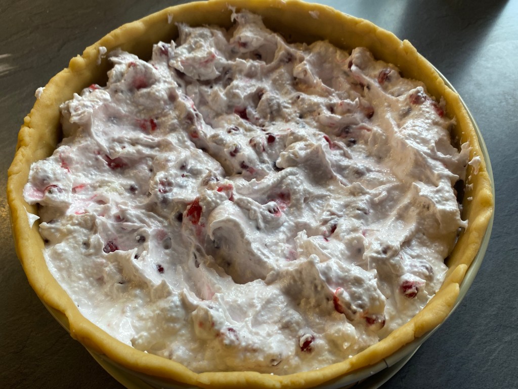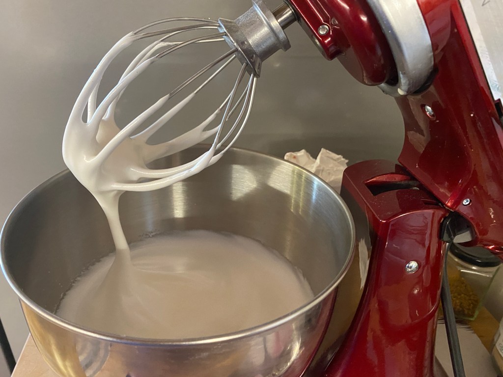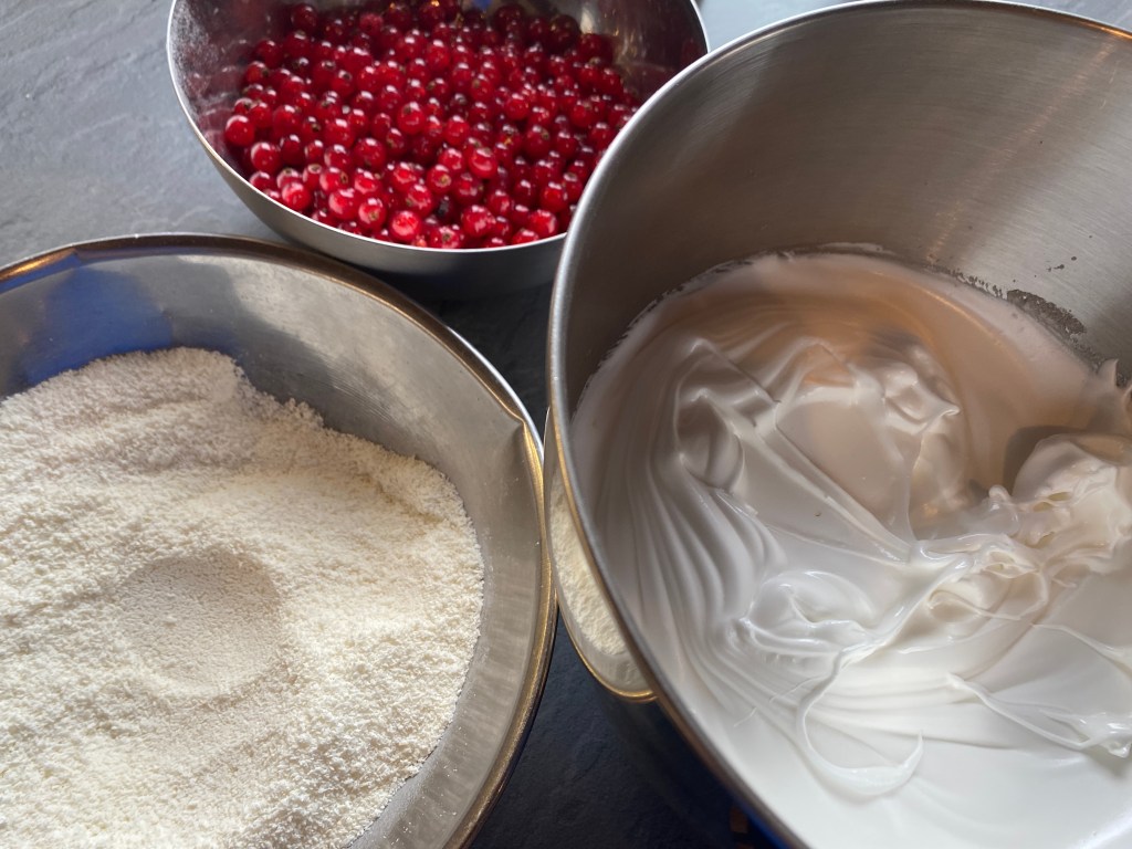 A tésztából megmaradt 2 tojásfehérjéhez még hozzáadunk kettöt, és elkezdjük felverni. Lassanként hozzáadjuk a porcukrot, és kemény habbá verjük. A kókuszreszeléket és az étkezési keményítöt összevegyítjük, és a ribizlivel eggyütt óvatosan a habhoz keverjük.