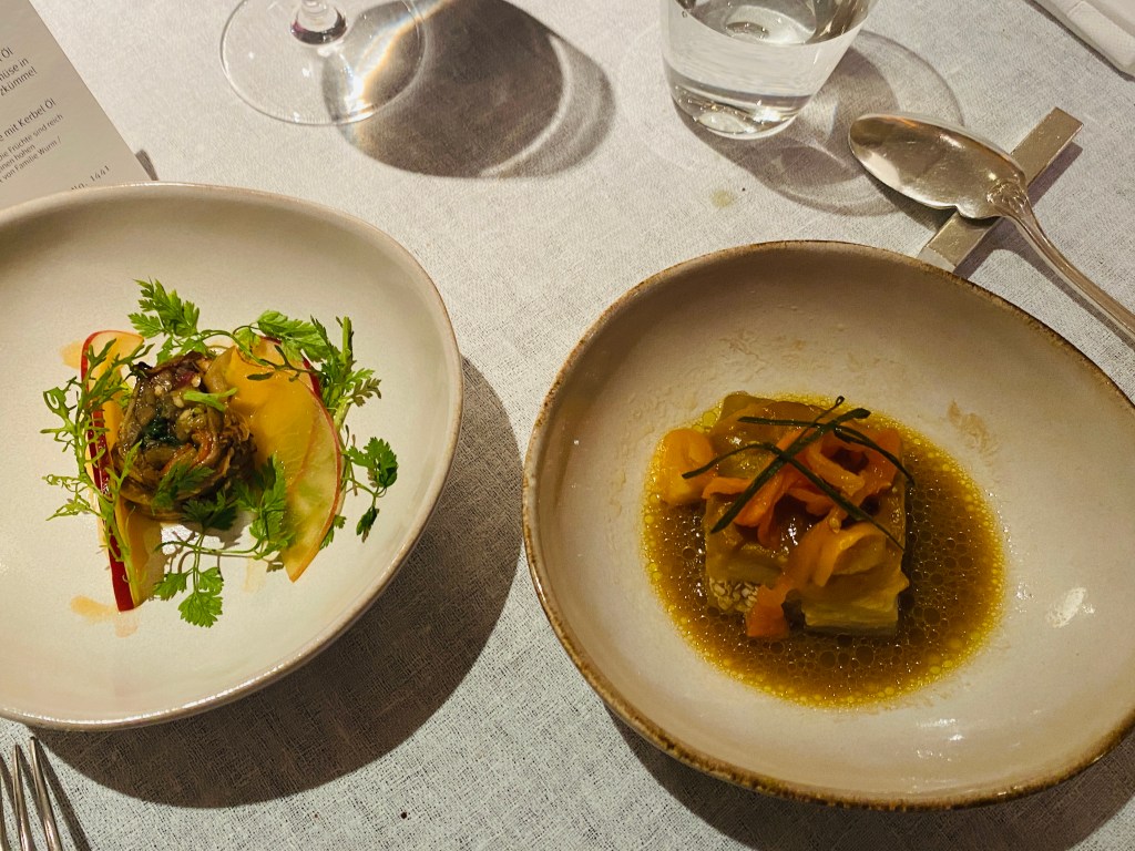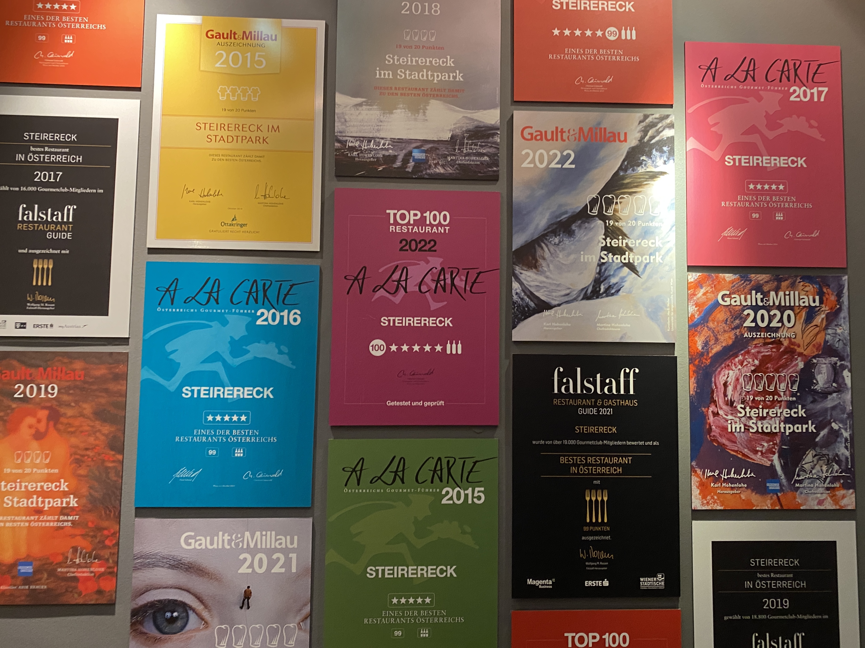 A sajtok, tejtermékek igen jó minőségűek (Stájerország sajtjai messze földön híresek), és természetesen a húsok (marha, sertés, szárnyasok, bárány, kecske, vadak). Nem dolgoznak tengeri halakkal, sem homárral, ezzel szemben naponta nyolcféle édesvízi halat kínálnak, az angolnától az olyan ritkaságokig, mint a gyöngy nevű pontyfajta. Ezek melett rengeteg friss zöldséget, gyümölcsöt és konyhakerti növényeket, már-már feledésbe merült gyógynövényeket, virágokat, használnak fel csúcsminöségi szinten. Megfordultam már néhány fine -dinning étteremben, de ilyen minöséggel még nem találkoztam.