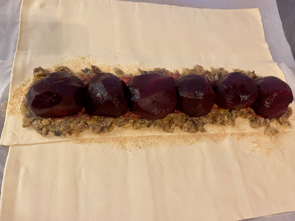 A levelestésztát kiterítjük, úgyhogy egymást fedjék , kb. 8 cm széllességben a közepén, és erre a részre kenünk egy réteg tölteléket. Erre ráhelyezzük a céklákat, és beborítjuk a töltelékkel.