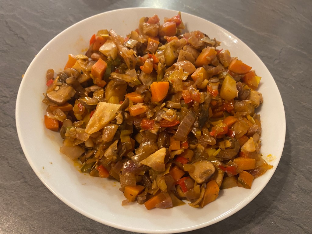 A zöldségeket megpucoljuk, apróbb kockákra vágjuk. A hagymát, a gombát vékony szeletekre. Egy serpenyöbe az olajat felhevítjük, rádobjuk az összevágott répát, zellert, pirospaprikát, hagymát. Ezeket jól lepirítjuk, majd hozzáadjuk a paradicsompasztát, elkeverjük, és hagyjuk karamellizálódni. Zöldség alaplevet készítünk 700 ml. vizben feloldunk két zöldségleves kockát, vagy két evökanál bulliont. A zöldségek alá öntünk egy keveset a léböl, hagyjuk párolódni, amikor már ragadna le ismét alá öntünk egy kevés levet, közben kavargatjuk. A zöldségeket àtöntjük egy nagyobb lábosba. A felszeletelt gombát a serpenyöben kevés olajon lepirítjuk. Ráöntjük a balzsamecetet, hagyjuk, hogy elpárologjon, így a savasságát elveszíti, viszont, szép sötét színe lesz. Hozzáadjuk a zöldségekhez, felöntjük a maradék alaplével, hozzáadjuk a kakukkfüvet, rozmaringot, fokhagymát, egy csillagánizst, a szója szószt. Az egészet fözzük, 25-30 percig, majd leszürjük a zöldségeket. A levét felforraljuk.