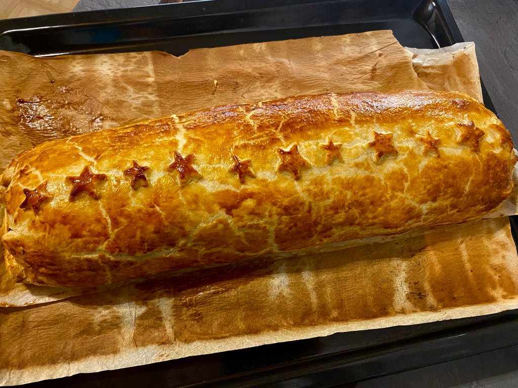 A töltelékre ráhajtjuk a tésztát, a két végét jól lezárjuk. Levágunk egy hosszanti csíkot a tésztából, ezzel dekoráljuk, csillag kiszúróval csillagokat vágtam ki. A tészta tetejét lekenjük felvert tojással, a vegánok növényi tejjel.