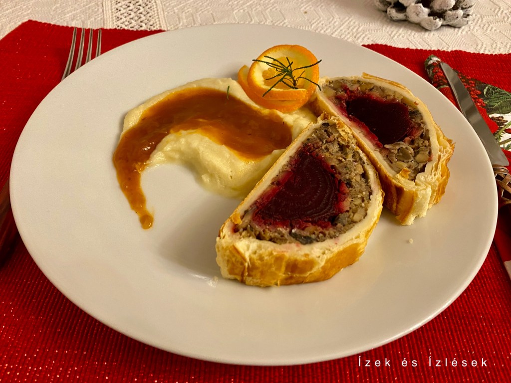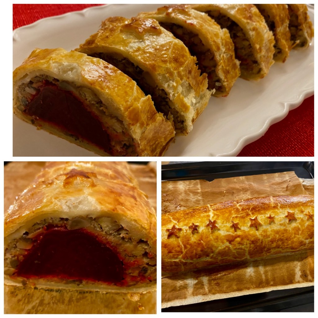 A Wellington bélszín egy hihetetlenül finom, ünnepi fogás még vegán változatban is. Bélszín helyett céklával, egy gombás-gesztenyés töltelékkel, vajas leveles tésztába csomagolva, és ropogósra sütve, garantált, hogy elnyeri a vegán/vegetáriánus vendégejink tetszesét.