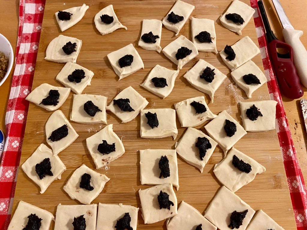 A közepébe nagyon kemény lekvárt teszünk. Èn nagyon finom szatmári szilvalekvárral töltöttem, ami annyira kemény, hogy szinte késsel vágható. De tölthetjük diós vagy mákos töltelékkel is.
