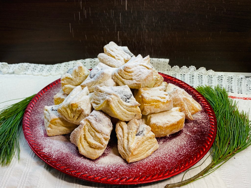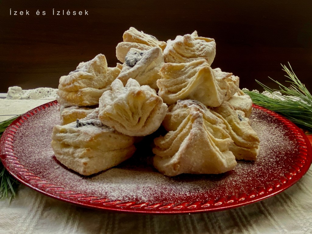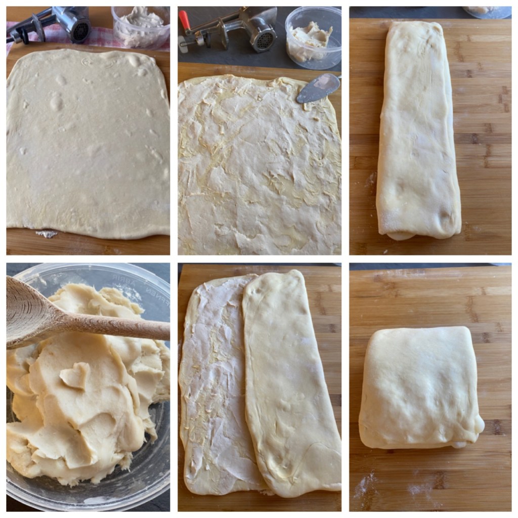Ezt a müveletet háromszor megismételjük, mindig 45 perc hütöbe pihentetéssel. Fontos a hajtogatási sorrend, hogy mindig ugyan ebben a sorrendbe hajtjuk. Az utolsó összehajtás után, 2-3 órát is pihentethetjük, majd egy megforrósított késsel kettévágjuk, és kb. fél centis vastagságúra nyújtjuk. Továbbra is felforrósítjuk a kést és gyors mozdulatokkal 6×6 cm.-es négyzetekre vágjuk fel.