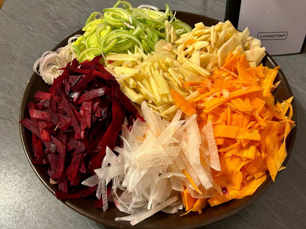 A zöldségeket alaposan megmossuk. A fermentálás elöfeltétele, hogy tisztán dolgozzunk. Mindent összevágunk vékony keskeny szeletekre, jó ha van erre a célra egy szeletelögépünk, mert gyorsan és szép egyformára összetudjuk vágni a zöldségeket.