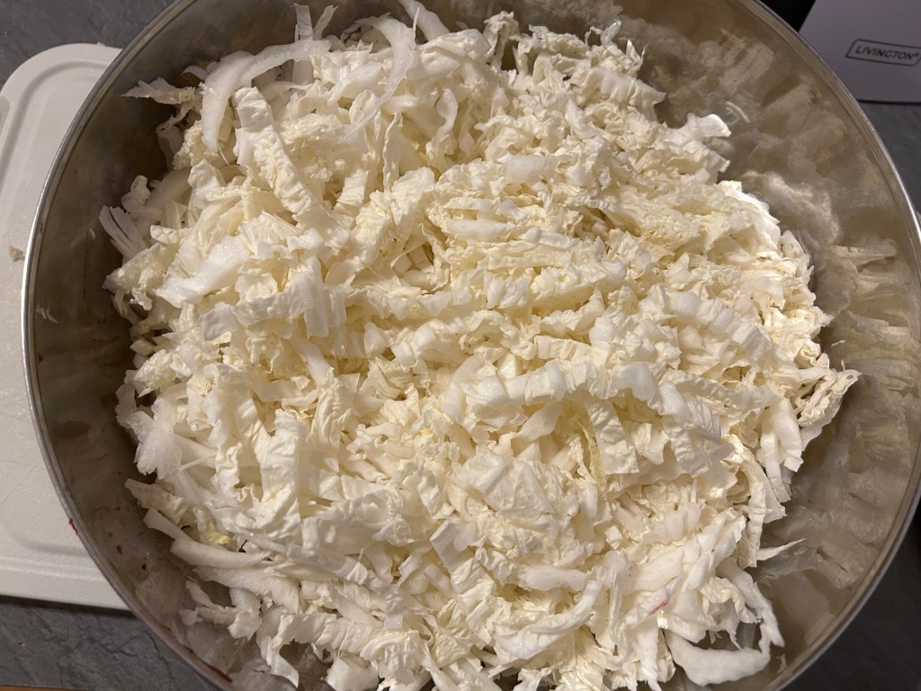 A kínai kel kivételével a felszeletelt zöldségeket lemérjük, kilónként 20 gr. só szükséges hozzá. Egy nagy tálban lesózzuk és hozzáadjuk a szójaszószt, jól összegyúrjuk. Letakarva a tálat hagyjuk egy órát pihenni. A kínai kelnek kivágjuk a torzsáját, a felsö két levelet levesszük róla, jól megmossuk és félre tesszük, a többit késsel csíkokra felszeleteljük.