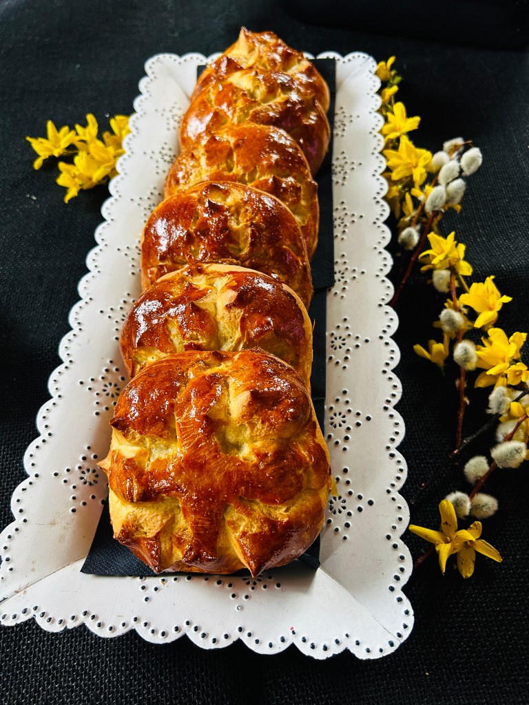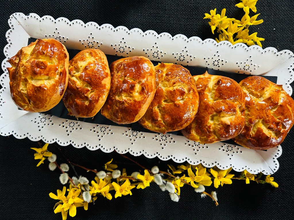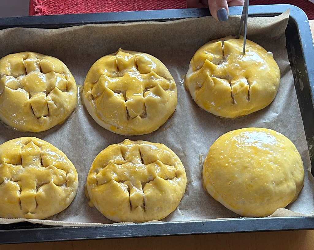Egy lisztezett deszkán kiszaggatjuk, 6-7 részre, kb. 150 gr.-os kis cipókat formálunk ki belöle. Lekenjük tojássárgával, és hideg helyen hagyjuk kelni 4-5 órát. Utánna ismét lekenjük a tetejüket egész felvert tojással, és egy ollóval keresztet metszünk bele, egymással párhuzamosan.