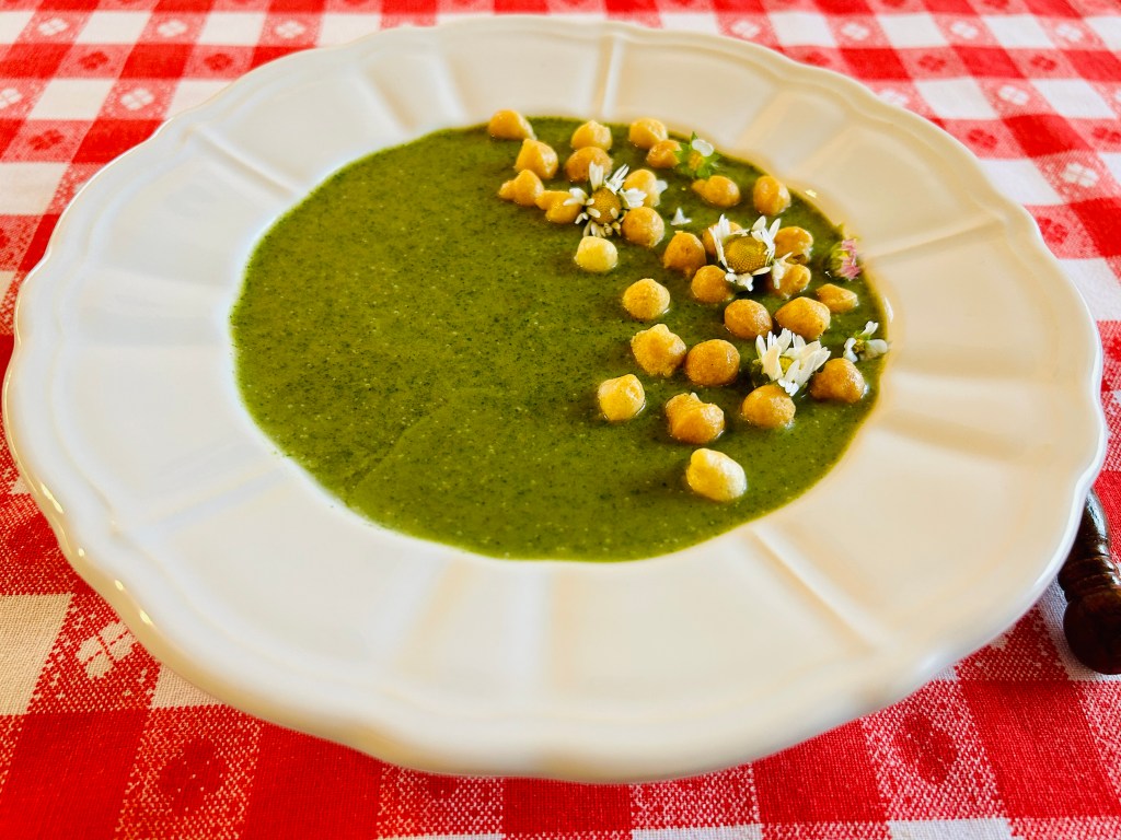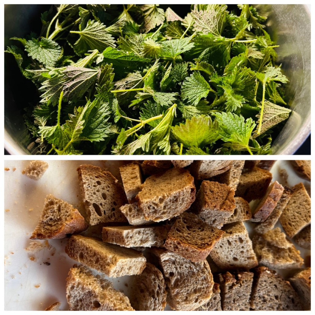 A megtisztított csalánt egy lábosban forró vizzel leforrázzuk, hozzáadunk egy teáskanál szódabikarbonát és 1-2 percig fözzük, majd leszürjük. Az olivaolajon az apróra vágott hagymát megfonnyasztjuk, hozzáadjuk a zúzott fokhagymát, a felkockázott rozskenyeret. Felöntjük kb.1,5 l vizzel, adhatunk hozzá egy zöldségleveskockát is, ha akarunk, Hozzáadjuk a csalánt, fözzük néhány percig, hozzáadjuk a tejszínt, vegánoknak vegán tejszínt. Majd botmixerrel pépesítjük, ìzesítjük, sóval, borsal citromlével, vagy almaecettel.