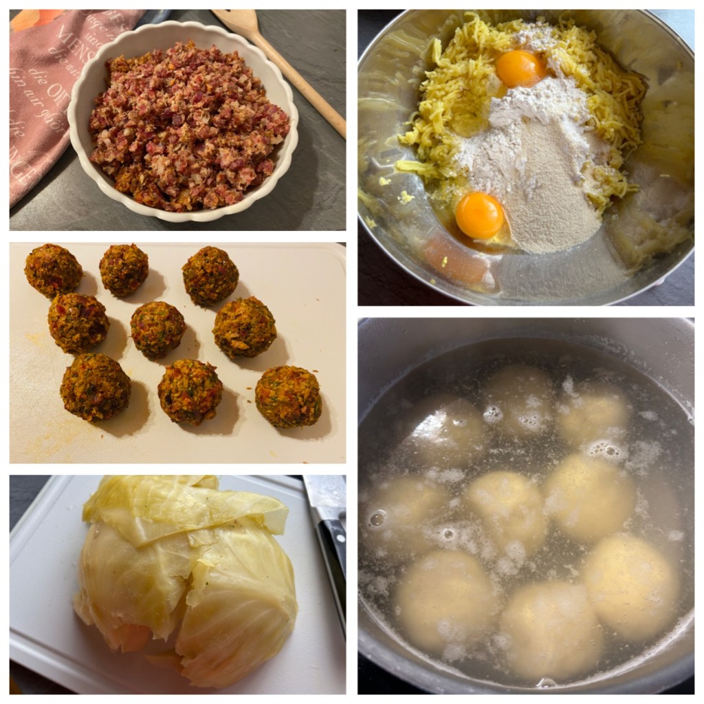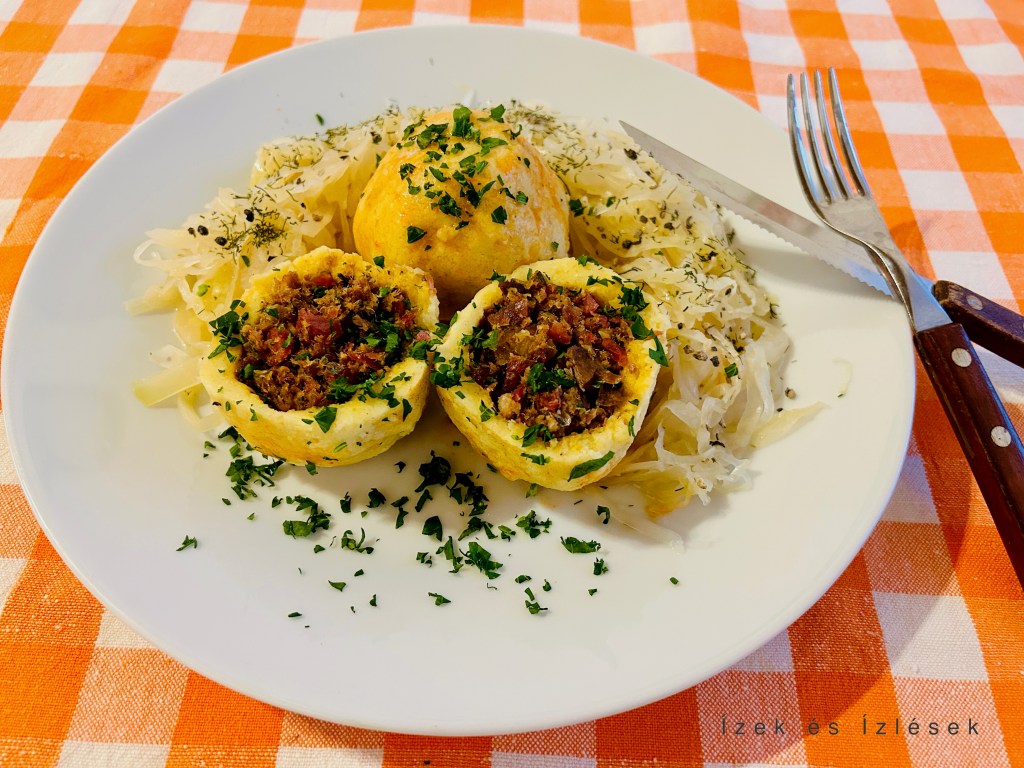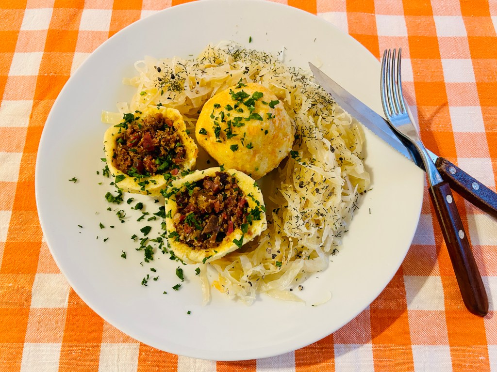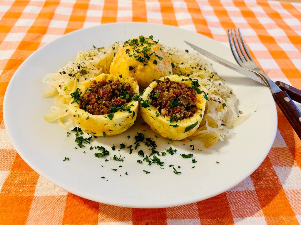 A hússal töltött krumpligombóc/ “Hascheeknödel”, “Fleischknödel”, tradicionális osztrák fogás, melyet párolt savanyúkáposztával kínálnak. Nem felejtem el az elsö élményem a húsgombóccal, fura meglepetés volt. Amikor áttelepültünk Ausztriába, hát már elég régen, egy vendéglöben kezdtem el dolgozni. Addig nem láttam, hogy hogyan készítik, csak, hogy a fagyasztott gombócokat beledobálják a fövö vízbe és káposztával tálalják. Egyszer ebédre én is ezt kaptam. Ùristen, hát hogy lehet ezt megenni, szilvásgombócot savanyúkáposztával, mivel én csak addig a szilvásgombócot ismertem. Pfújj! -forgattam körbe a tányért, most melyiket egyem meg, a káposztát, vagy a gombócot belöle.