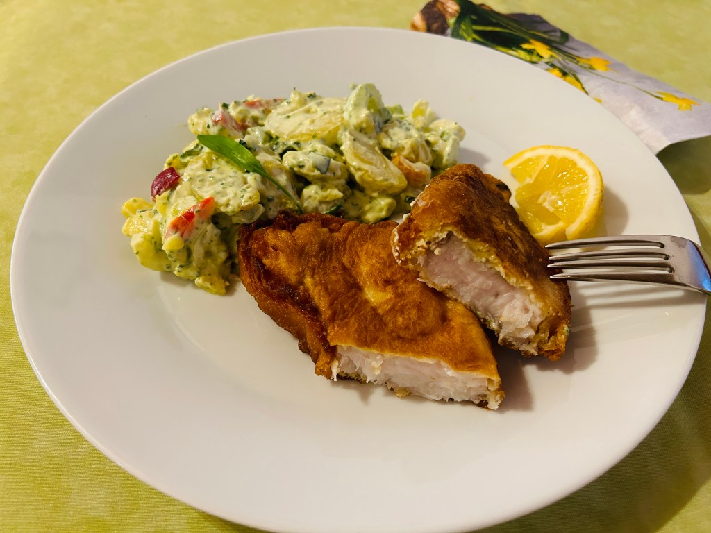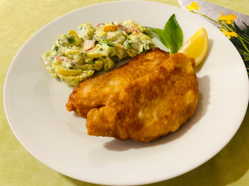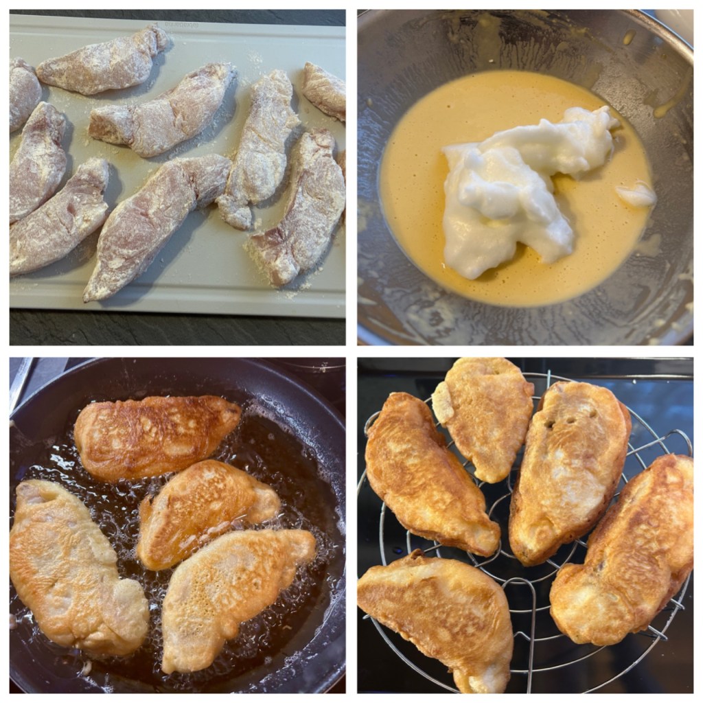 Egy egésztojást, és egy sárgát fölverünk, hozzáöntjük váltakozva a lisztet és a hideg sört, csipetnyi sót. Lényegében nincs egy pontos receptem, a liszttel tudjuk süríteni, a sörrel pedig hígítani. Az alap tészta egy sürü palacsinta tészta, melybe még belekeverjük a maradék egy tojásfehérje felvert habját. Forró olajban, aranybarnára sütjük. Amikor kivesszük az olajból, tegyük egy rácsra, melyet egy tepsibe belehelyezünk, hogy a felesleges olaj lecsöpögjön. Ne rakjuk konyhatörlöre, mert az alja begözölödik a hirtelen hötöl, és felpuhul.