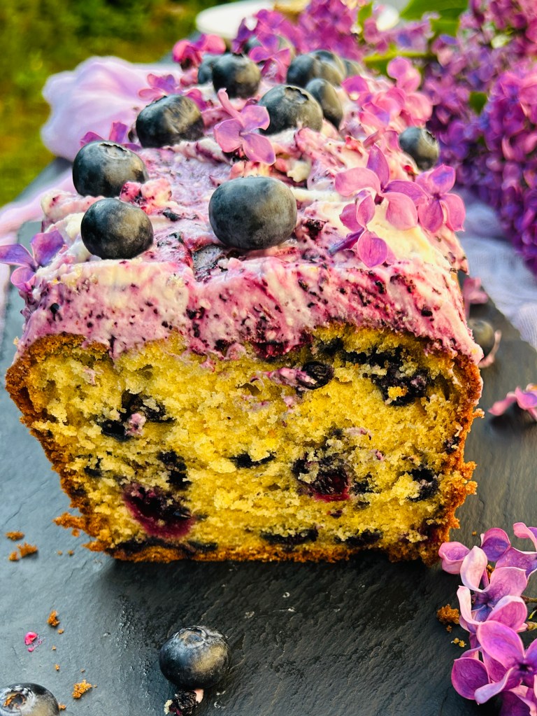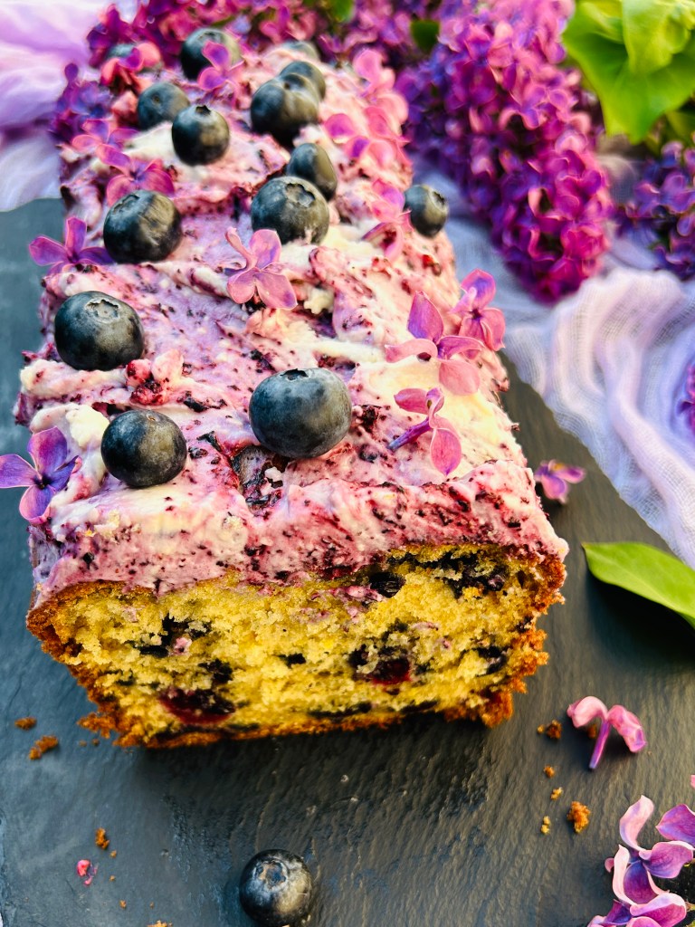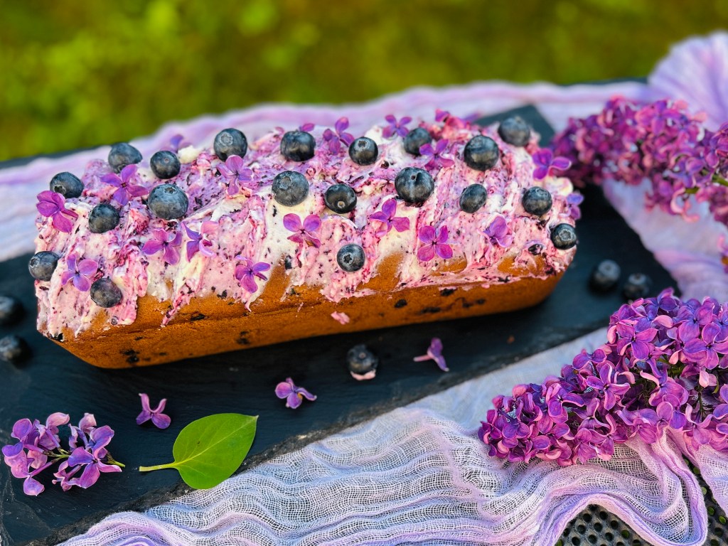 Miután kihült a tetejét megkenjük a krémmel. Fontos hogy a hozzávalók szobahömérsékletüek legyenek. Habosra kikavarjuk a vajat a porcukorral, hozzákeverjük a sajtkrémet. Az áfonyát összetörjük és a krém feléhez hozzákeverjük. Márványosan felkenjük a süteményre, a tetejét megszórjuk áfonyával.