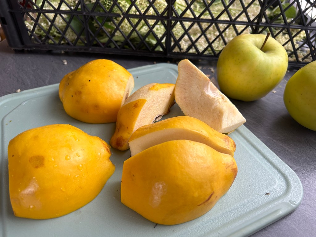 Másnap az almákat meghámozzuk, magházát kivágjuk, és felkockázzuk. Egy lábosba oda tesszük. Rászürjük a kiázott bodza levet, egy tiszta gézen jól átnyomkodjuk a virágokat.