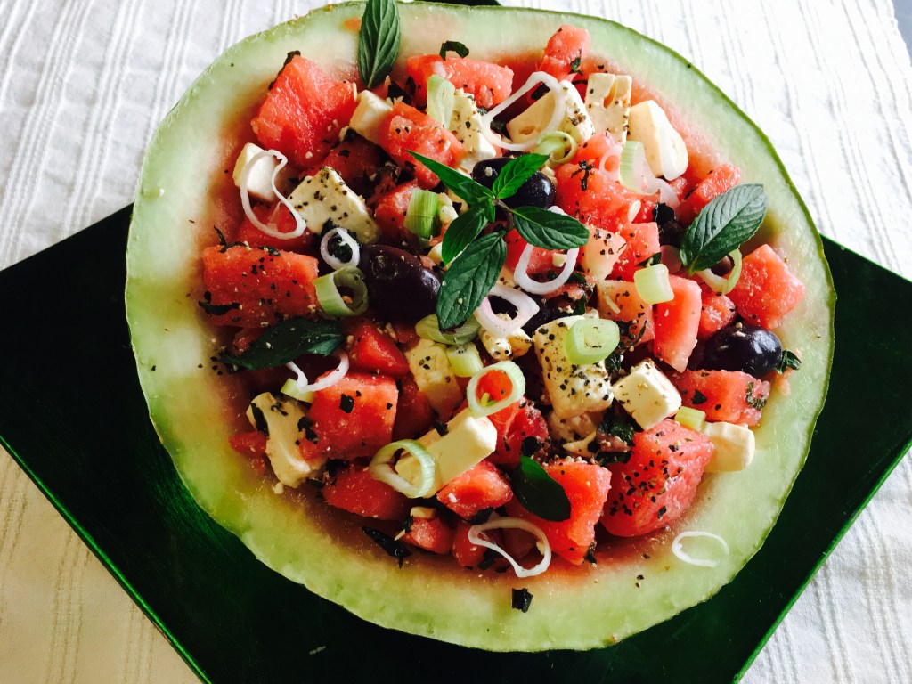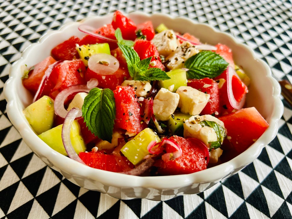 Annak ellenére hogy sokaknak furának tünik, egyik legjobb kánikula saláta. A jéghideg, mézédes görögdinnye, melynek nagy a víztartalma frissít és hidratál. A krémes sós fetával, pedig jól harmonizál. Uborka is jöhet bele, hiszen az íze semleges, szintén nagy a víztartalma, némi füszer, lehet bazsalikom, de inkább a menta, még frissebbé varázsolja. Egy édesebb lilahagyma , vagy ujhagyma vékony szeletekre vágva, szintén jöhet bele, akár a sós olivabogyó is. Tökéletes párost fognak alkotni ezek az alapanyagok ebben a mediterrán, frissítö salátában.
