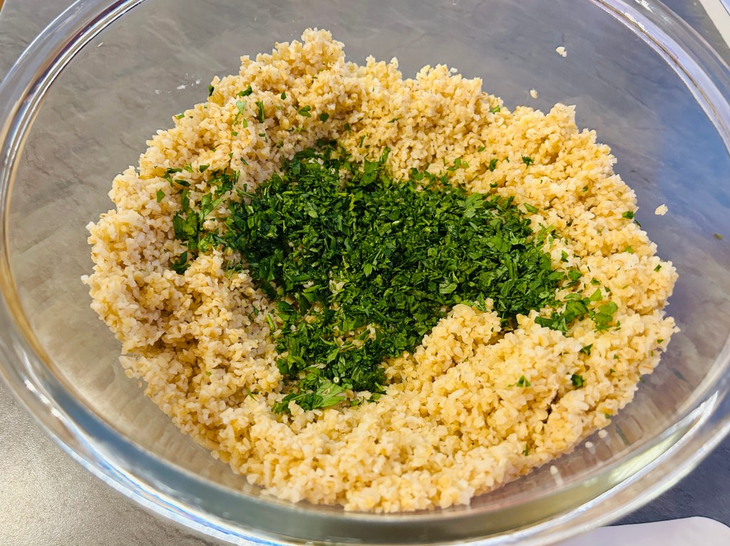 A bulgurt leforrázzuk, hozzáadjuk a sót, és lefödve hagyjuk 20 percet, hogy megpuhuljon. A petrezselymet és a mentát felaprítjuk. Tegyünk jó sok mentát bele, kétféle mentát is használtam, mojito mentát és az intenzívebb borsmenta levelet kb. 10 db.-ot.