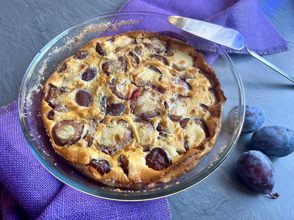 A szilvát megmossuk, kimagozzuk. Egy pite formát, vagy jénai tálat kikenünk vajjal és megszórunk egy kanál cukorral. A kimagozott és félbevágott szilvákkal kirakjuk. A tojásokat felverjük, hozzáadjuk a 2 evökanál cukrot, és a vaníliát. Hozzáadjuk a lisztet, a sót, a tejszínt és a tejet. Csomómentesre elkeverjük, majd ráöntjük a szilvára. A sütöt elömelegítjük 180 C°-ra, és 35-40 percig sütjük. Sülés közben szépen felemelkedik mint egy felfújt, de aztán ahogy kivesszük a sütőből gyorsan visszaesik, de ennek így kell lennie.