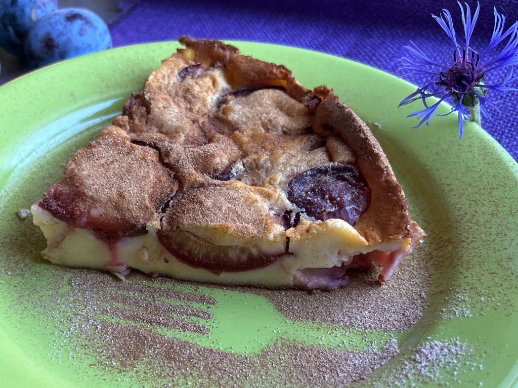 Mikor elkészült a szilvás clafoutis meghintjük fahéjas porcukorral és langyosan tálaljuk.