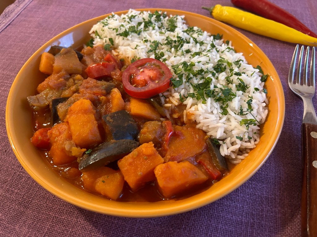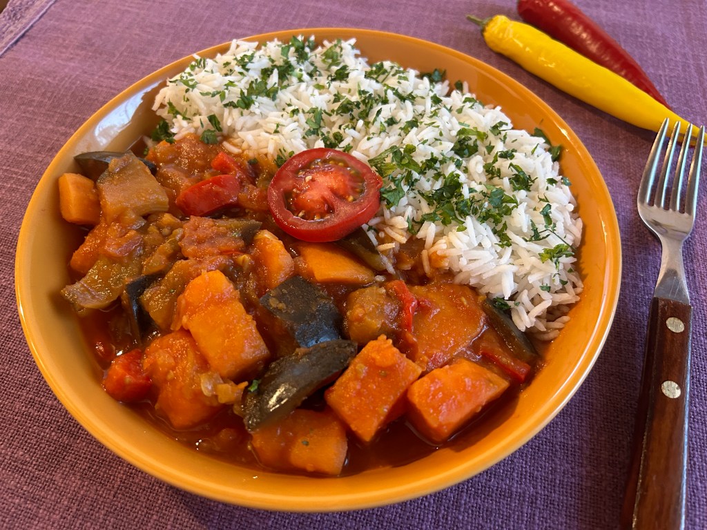 Egy lábasban az olivaolajat felhevítjük, rádobjuk a rómaiköményt, és hagyjuk ameddig pattogni kezdenek a szemek, majd hozzáadjuk az apróra összevágott hagymát, és a piros paprikát. Hozzákeverjük a curry pasztát. Hozzáadjuk a kockákra vágott édesburgonyát, a padlizsánt, és a kurkumát. A paradicsomokat pár percre forró vizbe dobjuk, lehúzzuk a héját, kockákra vágjuk és ezt is hozzádjuk. Felöntjük paradicsomlével, és adunk hozzá egy kevés cukrot, hogy a savasságát kiegyenlítsük.