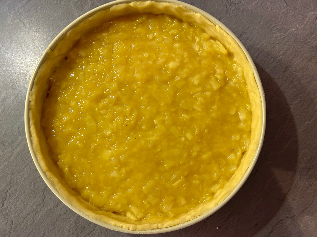 A bort feltesszük a cukorral föni, ha almalével készítjük akkor elég a fele cukor mennyiség is. A tojást felverjük, hozzáöntjük a 2 cs. pudingport, 5 evökanál folyadékkal, (víz , vagy almalé vagy bor)-elkeverjük, és a felforrt borhoz adjuk, alább vesszük a höt, és lassú tüzön besürüsítjük, majd hozzáöntjük az almát. Összekeverjük, majd hagyjuk kihülni. A tésztát kivesszük a hütöböl, kinyújtjuk piteforma nagyságúra (27 cm. átméröjü), a peremét is kibéleljük tésztával. A kihült tölteléket beletöltjük, egyenletesen elsímítjuk.